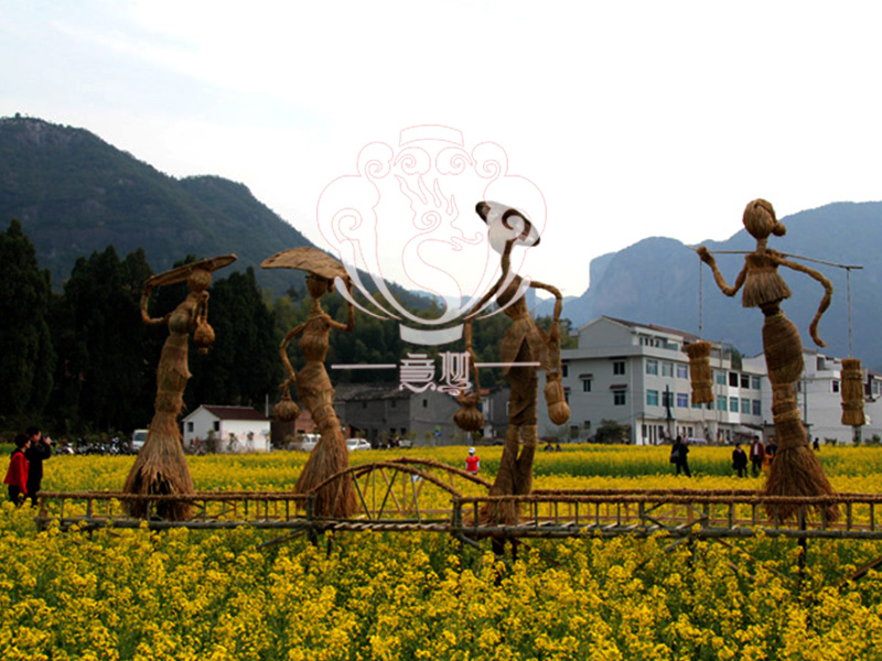 現在的精致稻草人藝術通常是由專業美術老師的造型放樣,然后由焊工師傅焊接出立體造型造型,然后以稻草或者稻草繩為材料編捆制作而成。