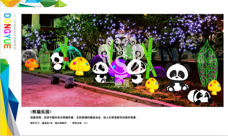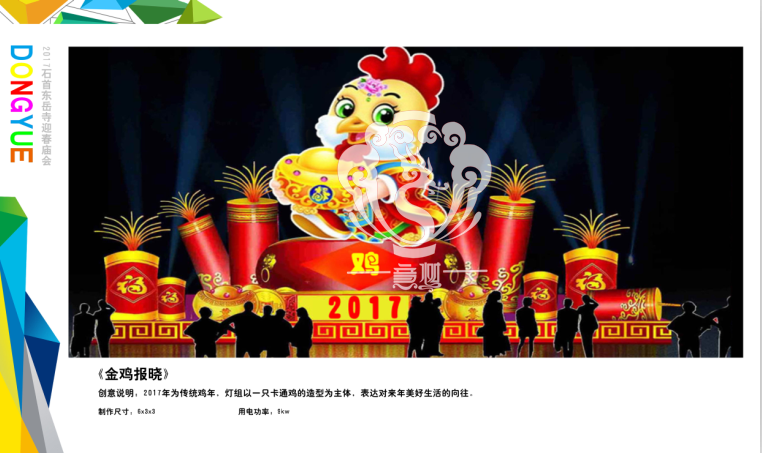 滿懷喜悅,深感榮幸。自貢市意樹文化傳播有限公司通過對湖北荊州石首東岳寺的實地考察,和我們的不懈努力,《湖北荊州石首東岳寺首屆迎春燈會方案》設計工作圓滿完成。我們結合東岳寺特色及氛圍營造亮化區域地形地貌,緊抓“歡慶佳節”的設計主題,把迎春燈會精心打造成2017年迎春的亮點,獻上盛大的視覺歡樂盛宴!