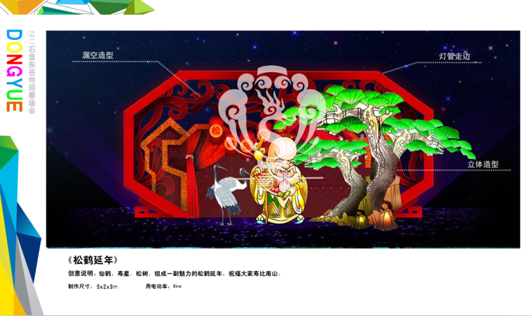 本次設計方案形式新穎、亮點突出、格調高雅,與“迎春、禮佛”的主題環環相扣,喜慶的節日氛圍在這交相輝映的盛世燈組中得到體現,讓整個東岳寺充滿著舞動心弦的魅力。透過本次高品位氛圍體會到時代發展為人們帶來了更新、更加美好的幸福生活。