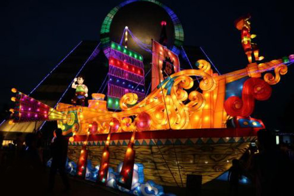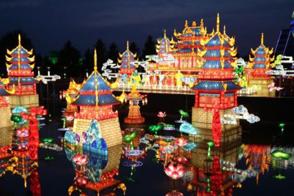 其中,“大唐華章”是名副其實的“明星”。這組長40米,高15米的彩燈由皇宮和荷花等“美景”組成,還原了大唐盛世時期,唐明皇與楊貴妃出宮游玩的情景。燈組座落于水上,和水中倒影交映,亦真亦幻。