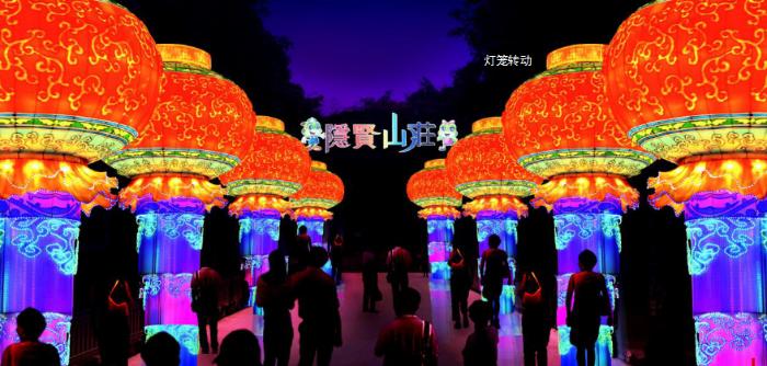 大型燈組大型組燈《隱賢山莊》長度達29米,高7米,燈組以“隱賢山莊,美麗常年”為設計主題,勾勒出一幅大氣磅礴的唯美花卷,全面地展現出隱賢山莊的風景,十分震撼。