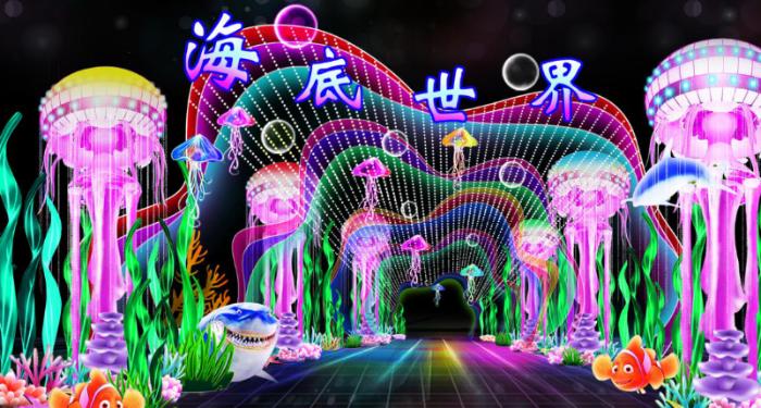 園內眾多栩栩如生的動物也切合區域主題,如寓意著幸運和吉祥的《圣鹿緣》,如這組大型通道燈組《海底世界》,長25米,寬8米,高5米,色彩絢爛夢幻,此燈組以唯美的水母,海藻,海魚等生物制作而成,當我們步入其中,給人暢游海底之感。