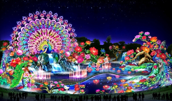 園內130余組彩燈凸顯“高大新奇美”的彩燈藝術特色,《普天同慶》、《華夏樂章》、《盛世華章》等巨型彩燈體量震撼,如畫似景。多年未出現的瓷器燈、竹編燈、玻璃瓶燈組精彩呈現,體現了自貢燈會的獨特魅力。大體量、集群式燈組繽紛奪目,編鐘燈組重達102噸,大孔雀燈組高達22米,創造了大型燈組的歷年之最,將給觀眾帶來驚喜。