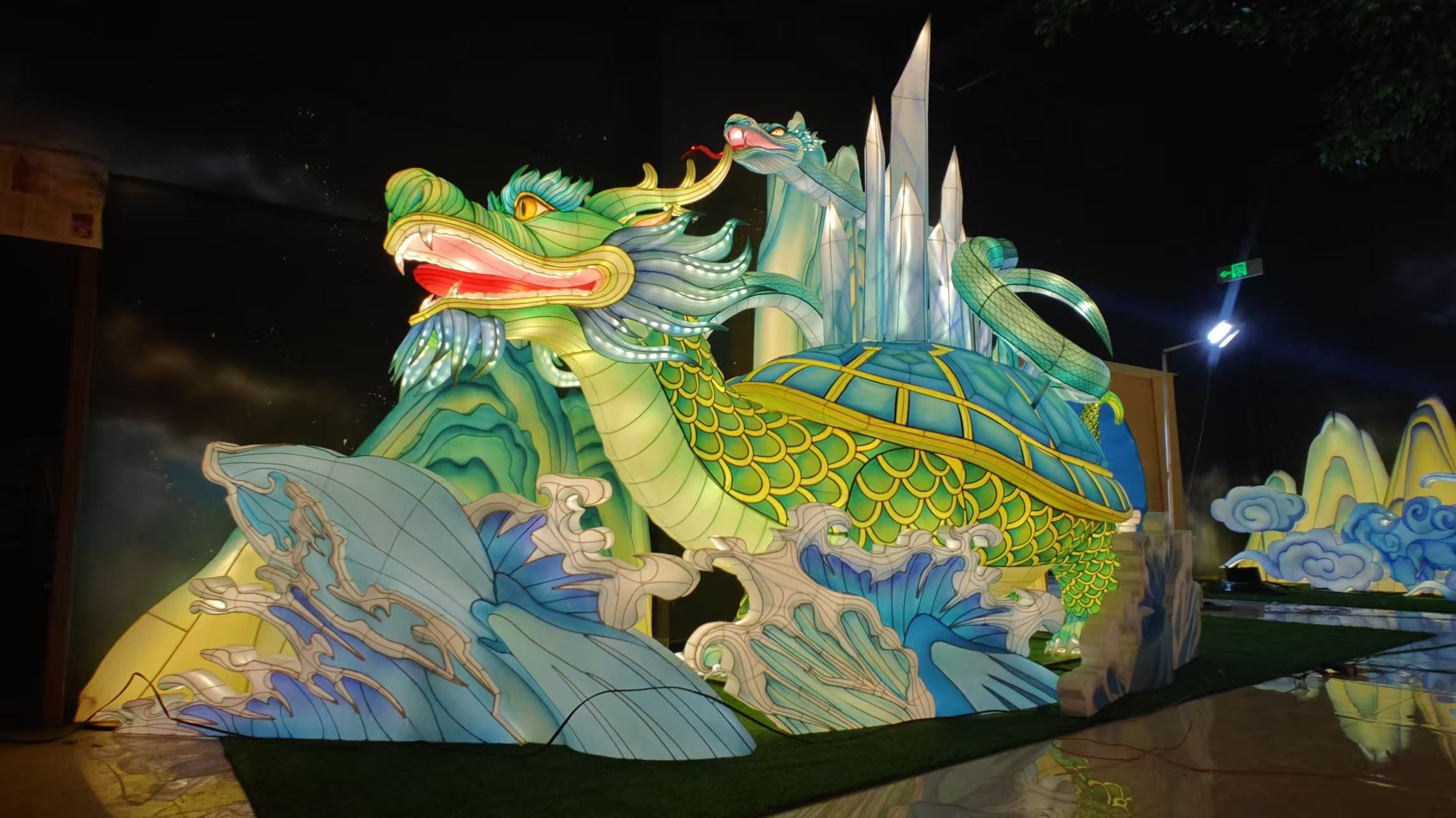 作為國內目前規模最大的花燈展廳,意樹文化團隊以 “還原上古宇宙” 為目標,打造出涵蓋三大主題展區的燈影秘境。從前期研讀《山海經》《淮南子》等典籍繪制百張設計圖,到組織 60 余名工匠歷時 3 個月手工制作,團隊始終堅守嚴苛標準:焊工需保證每處骨架接口誤差不超 1 毫米,裱糊工為呈現神明衣袂飄逸感,需徒手拉伸絹布至精準張力,美工則參照出土文物紋樣復原上古圖騰。