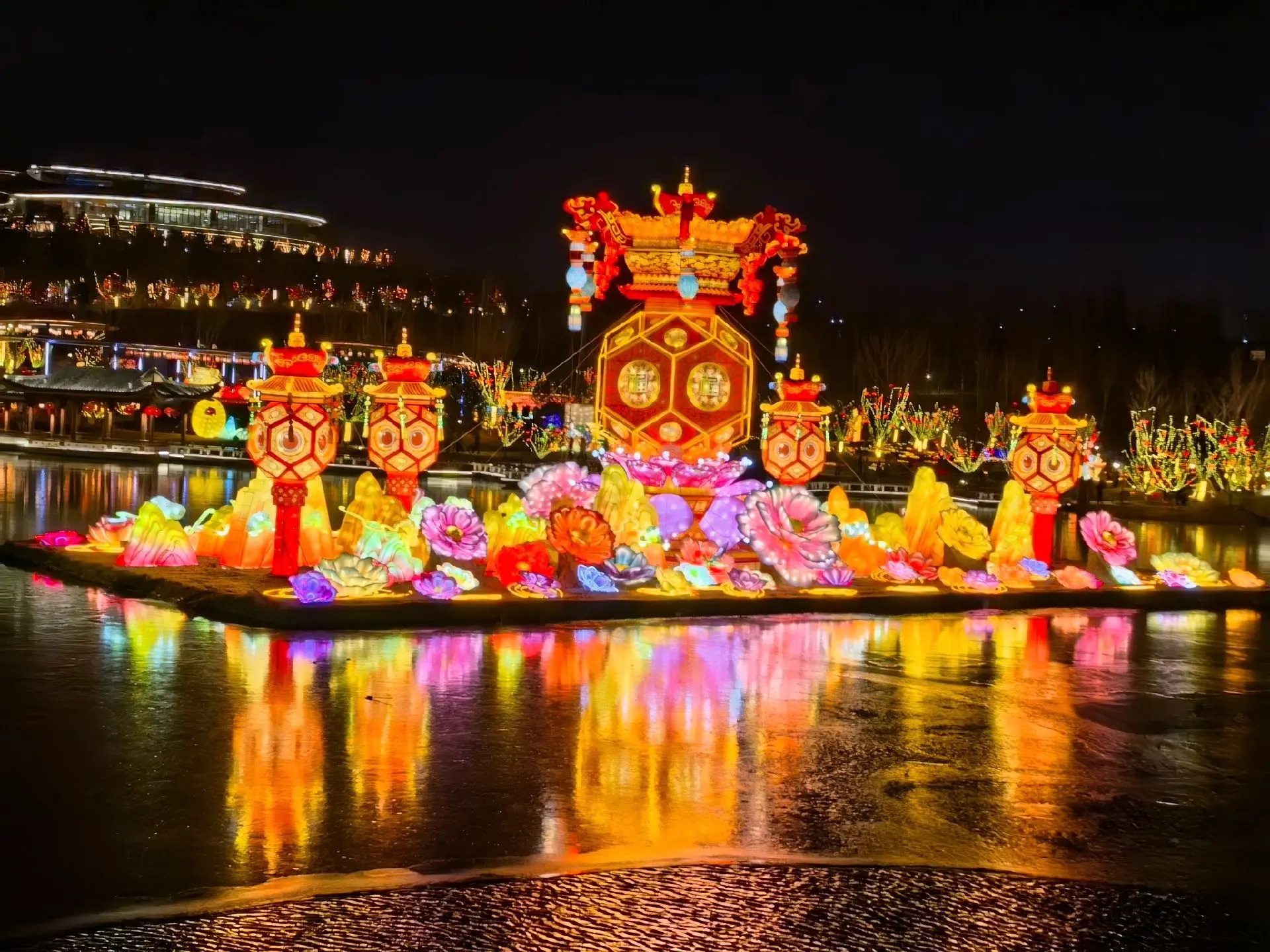 燈展現場,千燈萬盞與龍馬湖的山、水、橋景相映成趣,構筑成一幅絕美的新春光影畫卷。高達十二米的“富貴平安”燈組喜慶洋溢,五顏六色的牡丹花團錦簇,成為全場焦點;