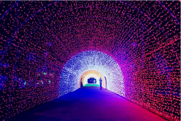 當天晚上7點00分,當燈光亮起的那一剎那,全場一片驚呼,早已等候多時的市民紛紛涌向檢票口,穿過一條長長的“時空隧道”,來到布滿各色形狀燈光的夢幻天地。燈光配合動感的音樂閃動著,愛心拱橋、戲水的天鵝、美麗的富士山、食草的小鹿,還有古代的馬車,令參觀游客連連稱贊,大家紛紛拿出手機、相機,擺出各種姿勢拍照留念。